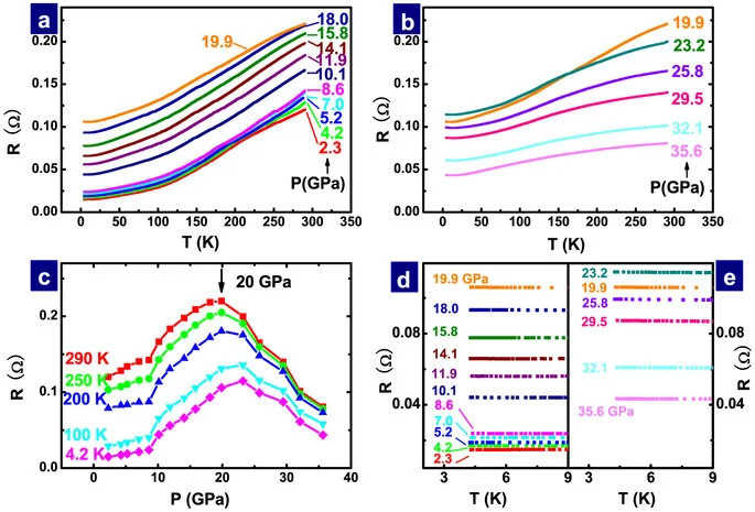 (a) and (b) Temperature dependent resistance of Ba0.61K0.39Mn2Bi2 at different pressures. (c) Pressure dependence of resistance measured at different temperatures, displaying a dome-like feature centered at ~20–23 GPa. (d) and (e) Blown-up R-T curves at different pressures, showing no evidence of superconductivity.